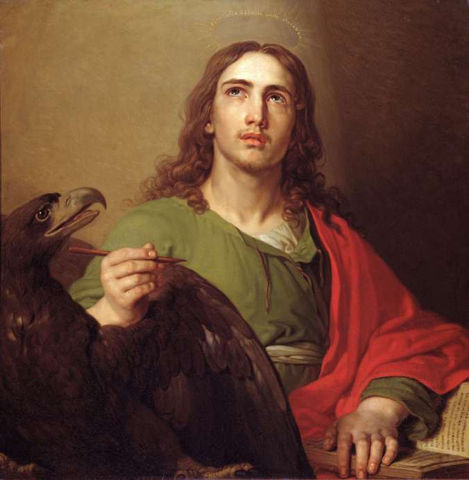 St. John, the author of this week’s Gospel, has been the focus of many artists. The Russian artist Vladimir Borovikovsky (1757-1825) depicted John as young and deeply attentive, almost as if he’s pausing to listen before he writes. That quiet, upward focus fits the long Christian tradition that sees John as the evangelist whose vision “soars” toward the divine. The eagle beside him comes straight out of that tradition: early Church Fathers linked John to the eagle in Ezekiel and Revelation, saying his Gospel rises highest into the mystery of Christ’s divinity. Borovikovsky leans into that symbolism but softens it—his eagle isn’t dramatic or fierce, just steady and companion-like, echoing John’s contemplative gaze. Painted in the early 1800s, the whole scene feels gentle and intimate, shaped by the luminous, polished style that marks Borovikovsky’s mature work and by the deep iconographic heritage he’s quietly carrying forward.